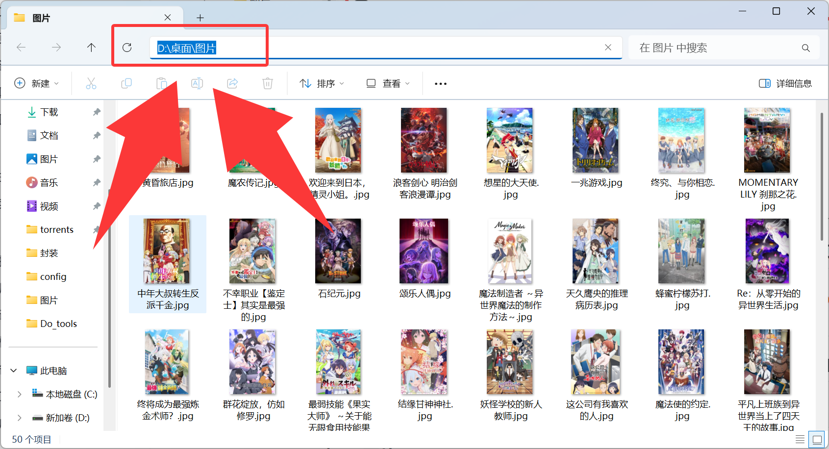 位置替换为红箭头所指向的位置set "cover=D:\桌面\图片"