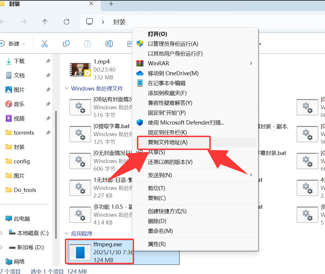 复制出来的路径是有一个双引号的,只需要路径位置填入下边就好了"D:\桌面\封装\ffmpeg.exe"