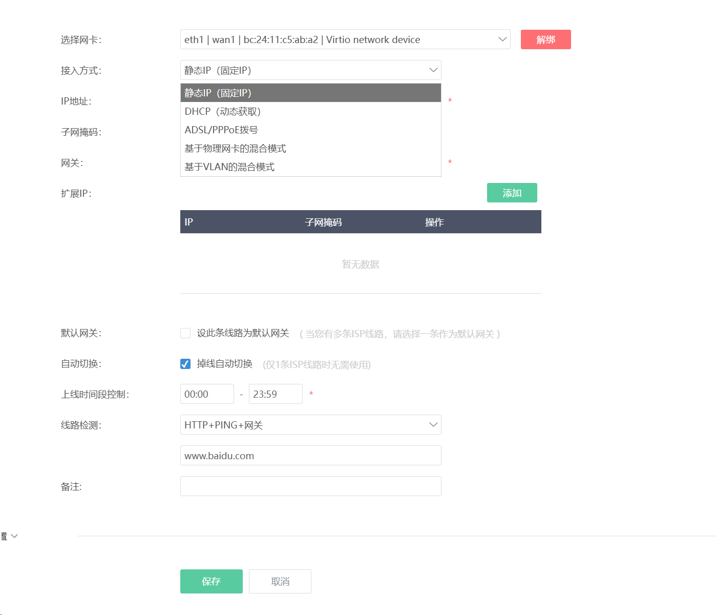 内外接口选择lan1 绑定外网线路选择wan1 点击保存