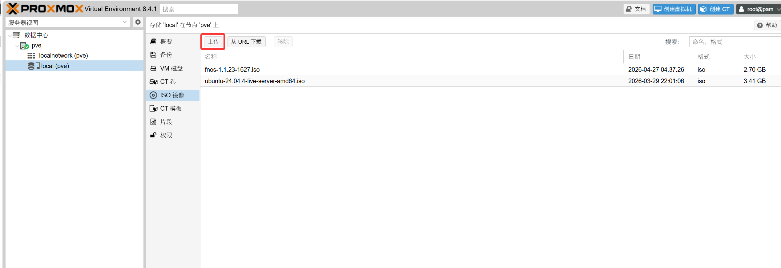 打开PVE的网页,点击local——ISO镜像——上传