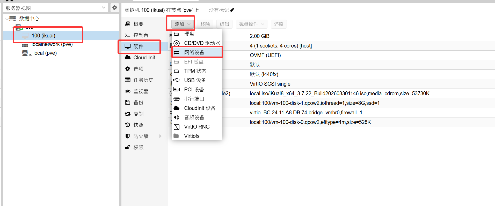 然后在pve下选择你的虚拟机——硬件——添加——网络设备(其中一个作为wan口一个作为lan口)如果做家庭主路由建议去找更加详细的教程,我这边添加两个作为wan lan口的模拟