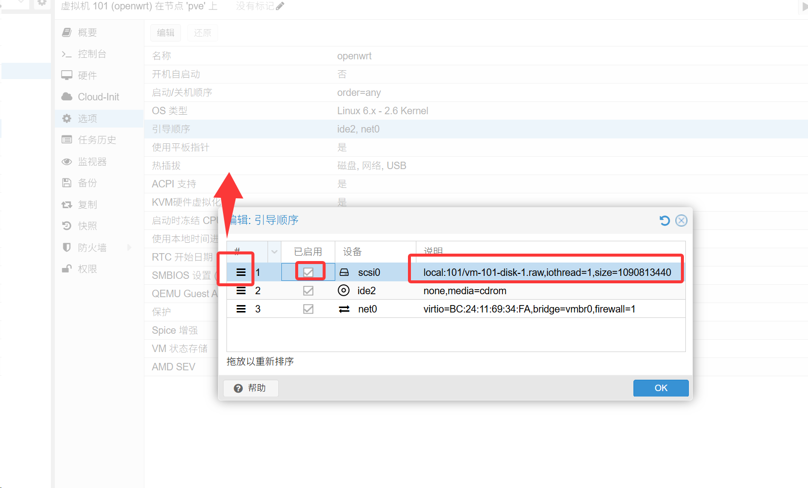 然后修改引导顺序,点击选项,双击打开,将刚刚的磁盘拉到最上边,然后勾选已启用,点击OK
