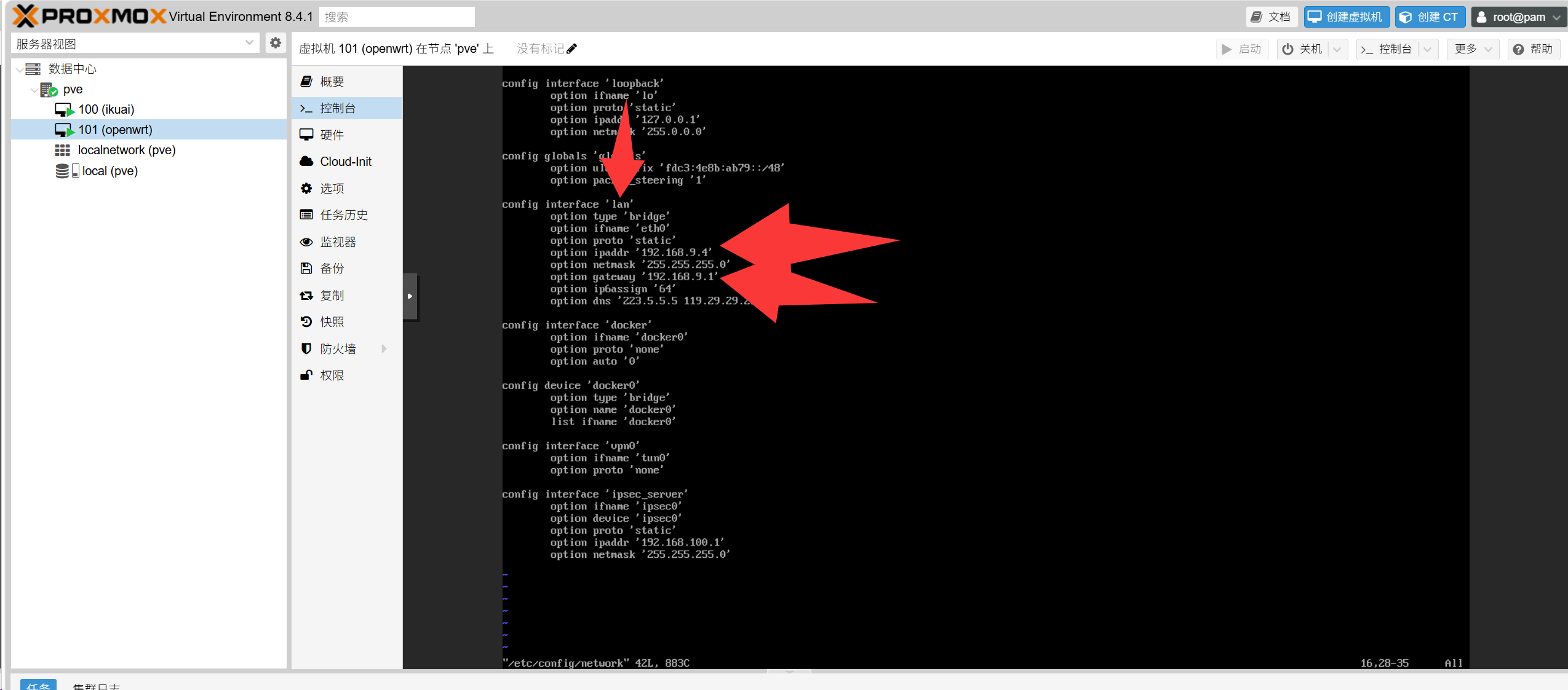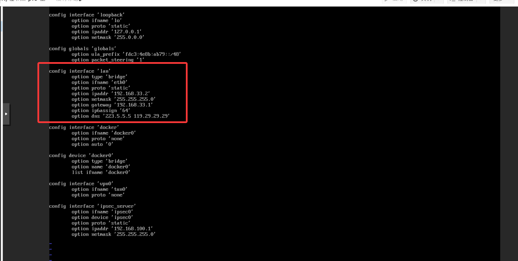 在控制台里输入vi /etc/config/network
