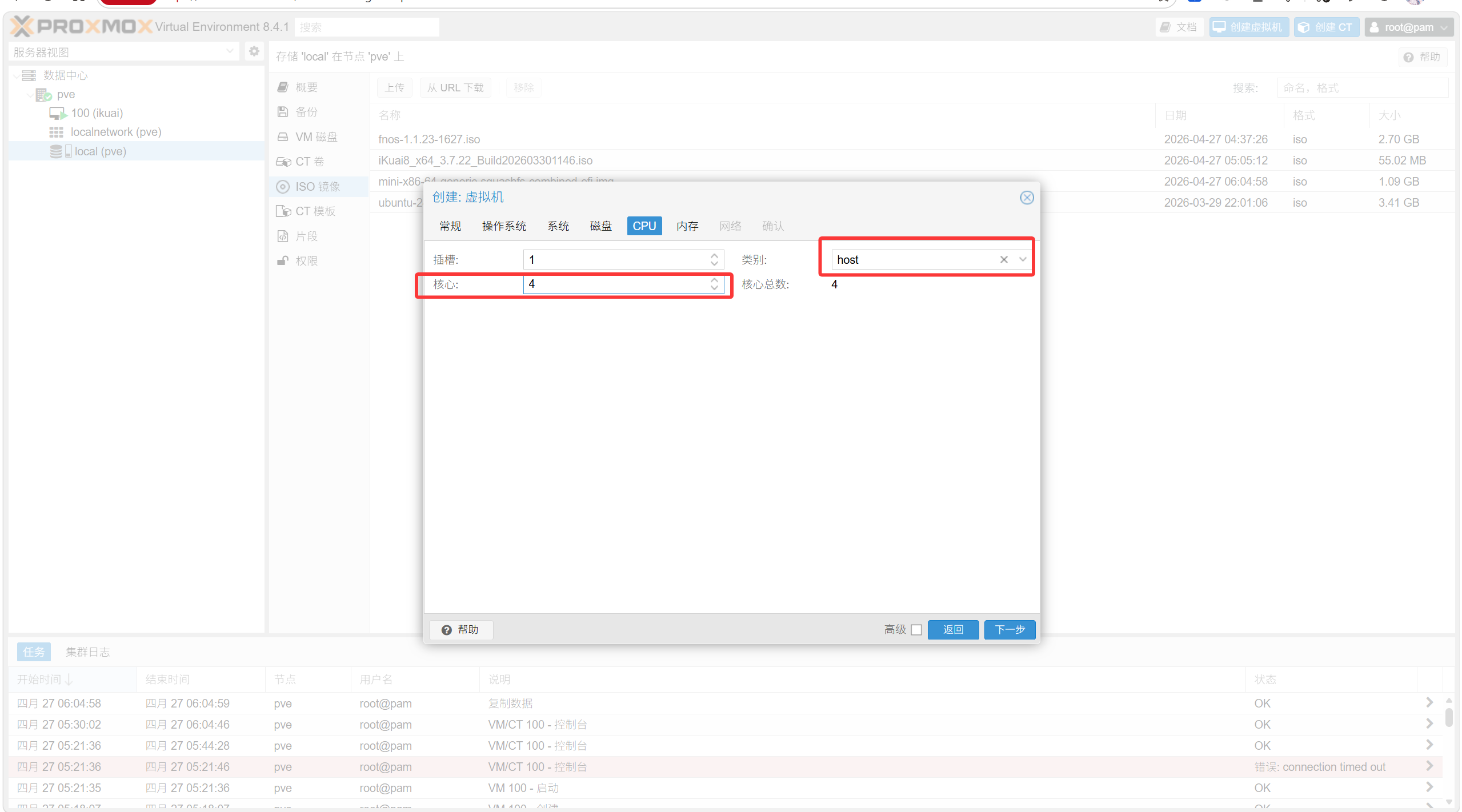 核心改成4核,类型为host