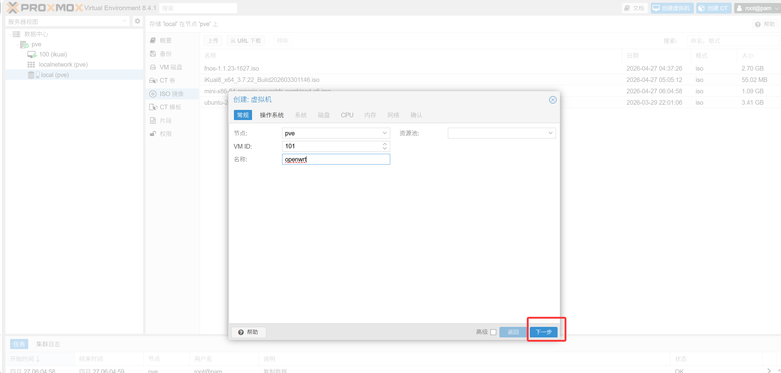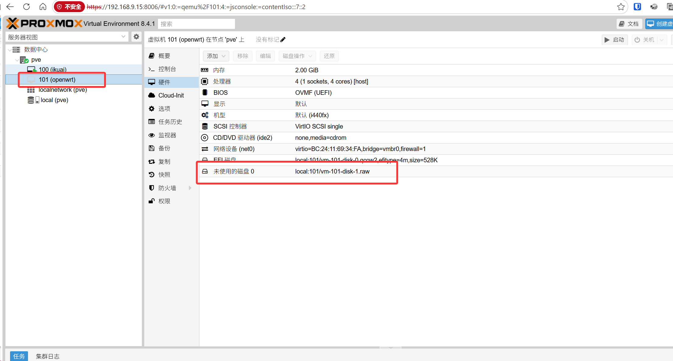 qm importdisk 101 /var/lib/vz/template/iso/plus-x86-64-generic-squashfs-combined-efi.img local虚拟机id为,左侧pve下100 (ikuai) 101 (openwrt)