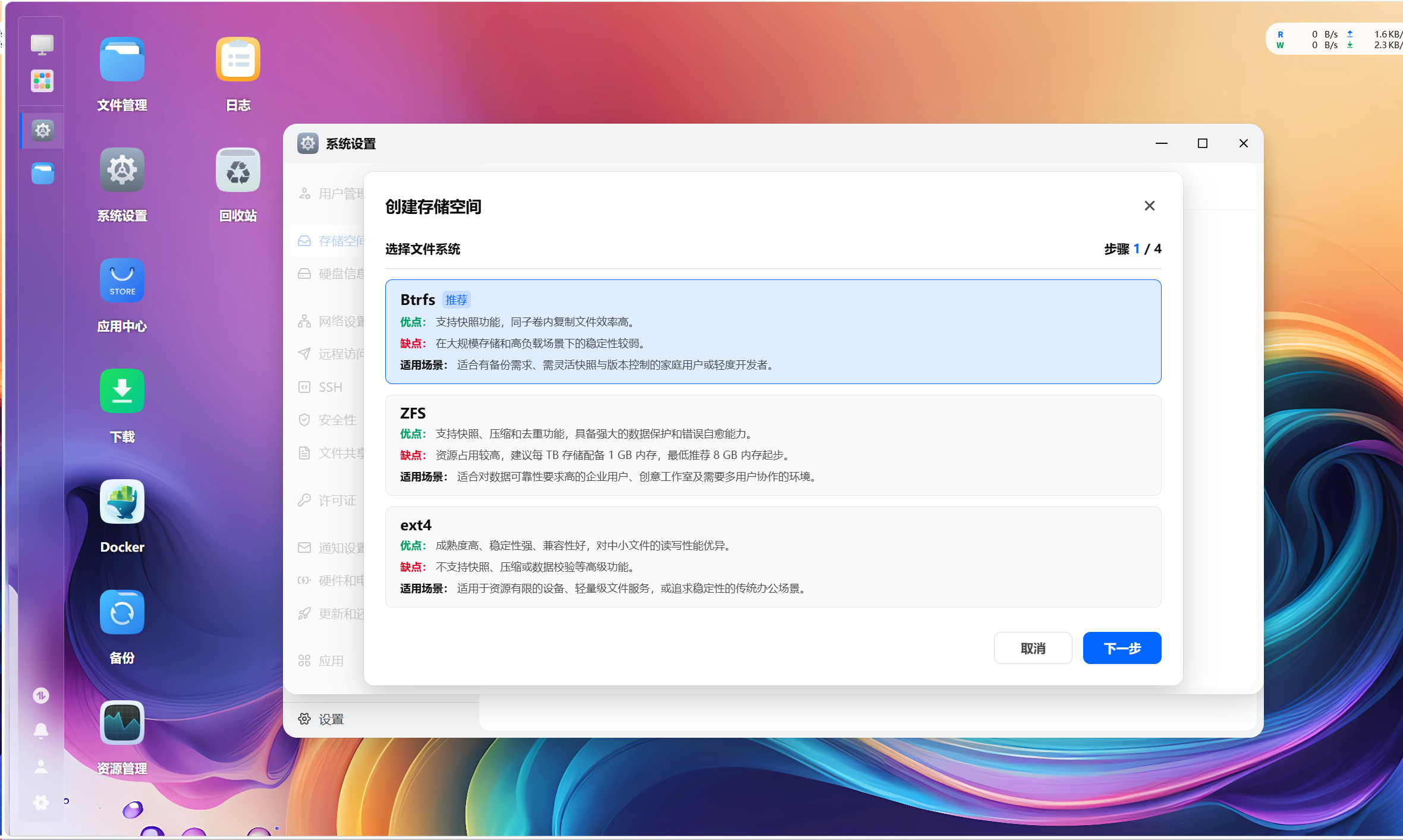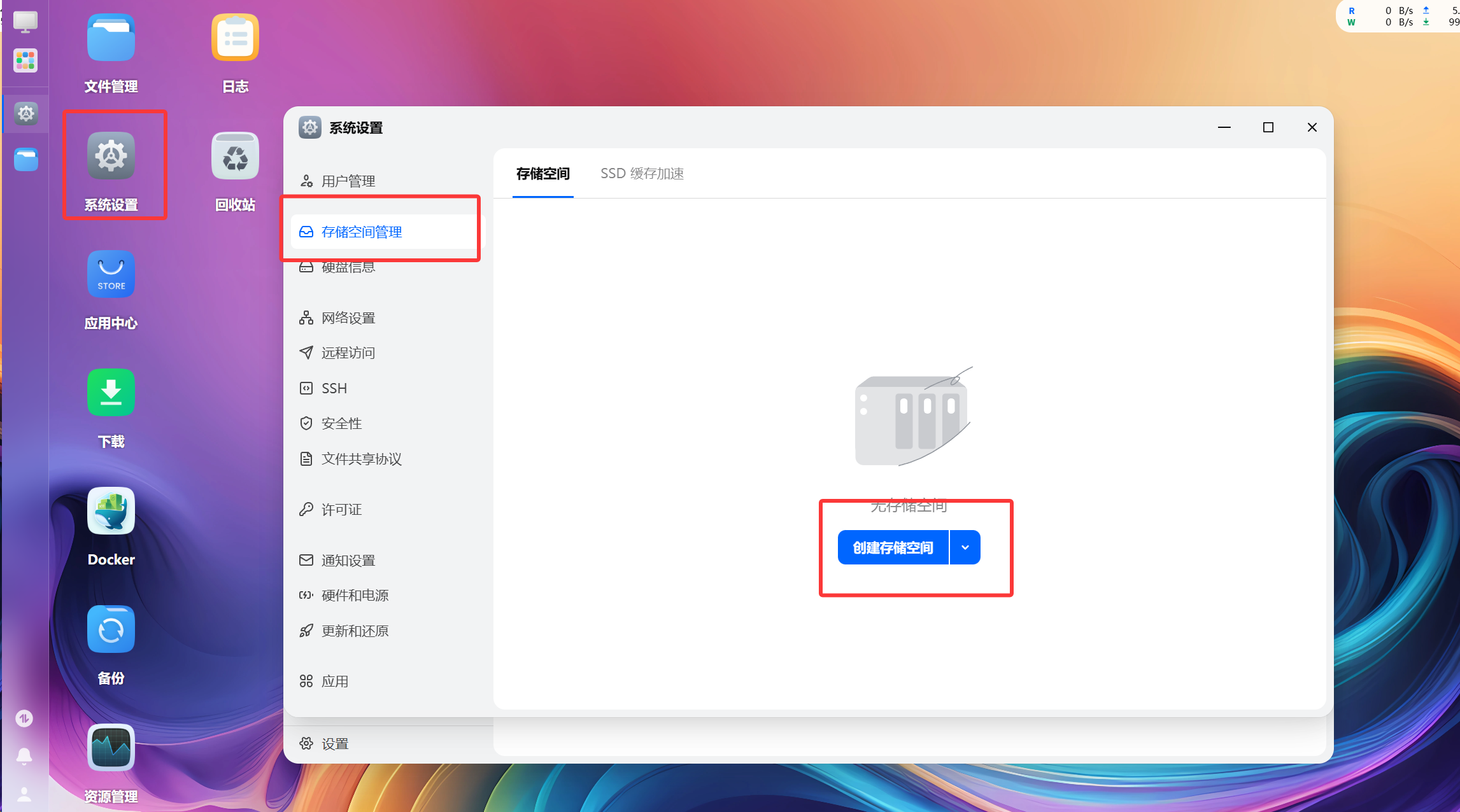 创建存储池 系统设置——存储空间管理——创建存储空间