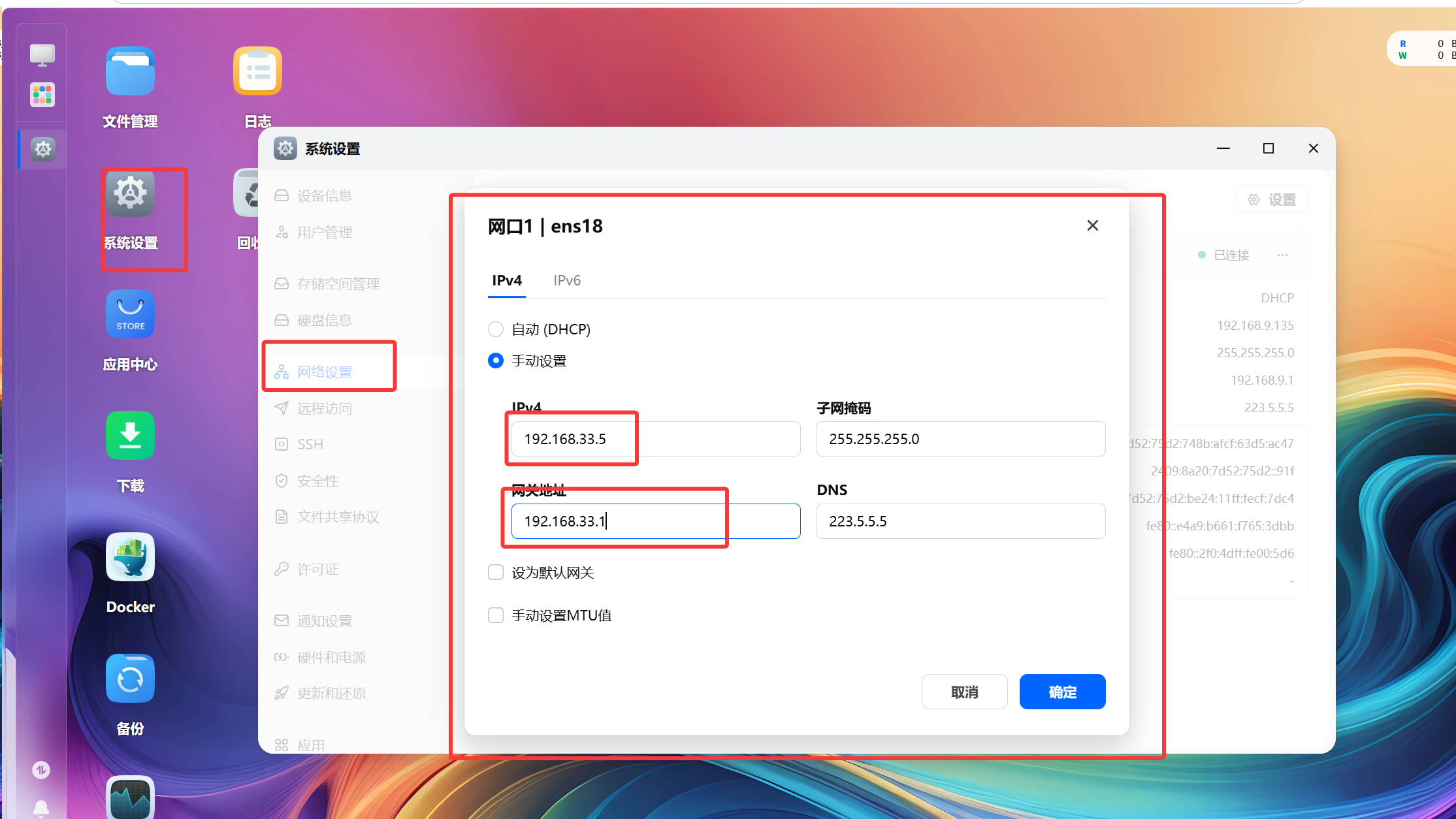 进入系统——选择系统设置——网络设置——将ip固定