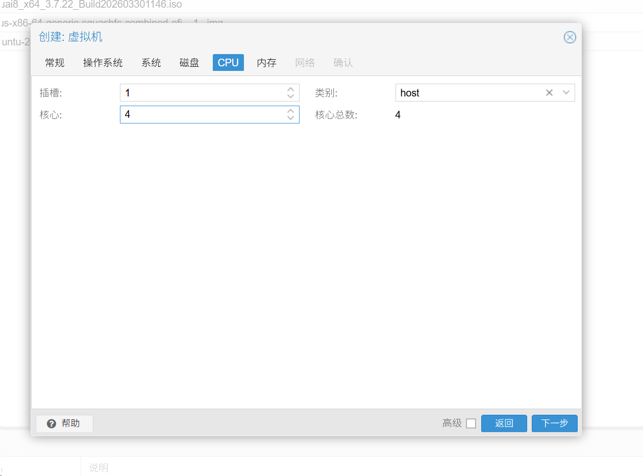 类型host 核心 4 这个核心根据你主机来选择,可以多一点