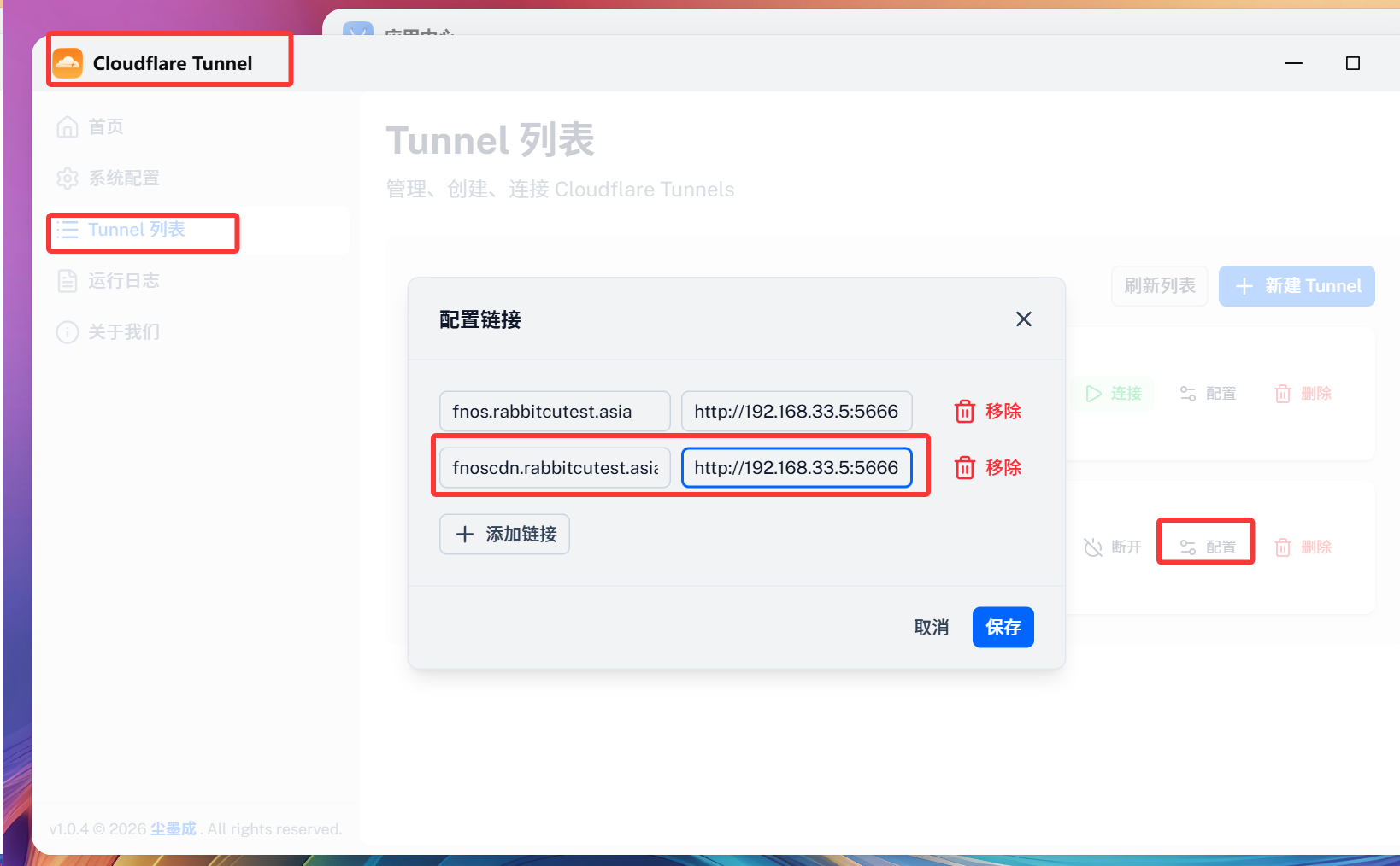在Cloudflare Tunnel隧道列表中选择配置添加链接